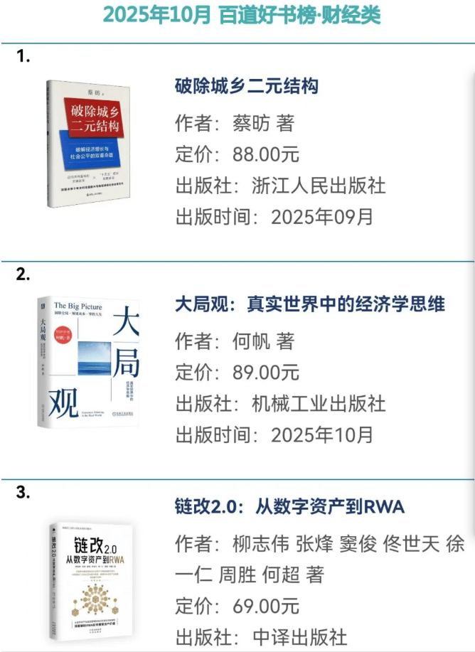此次《链改2.0:从数字资产到 RWA》入选百道好书榜财经类第三名,不仅体现了市场对“RWA这一前沿领域的关注,更凸显了该书在理论+实践层面的价值。对于企业而言,该书可作为资产数字化转型的操作手册;对于投资者而言,可帮助其理解RWA 领域的投资逻辑与风险边界;对于行业研究者而言,則提供了链改2.0时代的核心理论框架,为数字经济与实体经济的深度融合提供了重要参考。随着 RWA 技术的不断成熟与应用场景的持续拓展,该书的出版或将成为推动我国链改2.0发展的重要助力,为全球RWA产业生态的构建提供中国视角与 中国方案。返回搜狐,查看更多